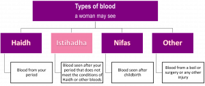 Having determined the type of istehadha, there are now different rules for the different types of blood. We have already talked about how to determine the type of istehadha blood above.